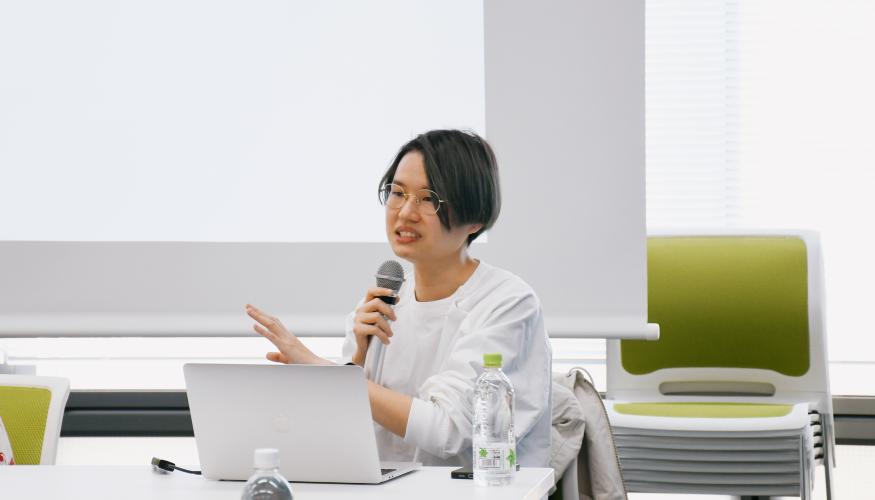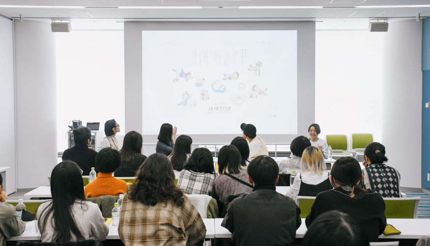 在電通,八木彩以商業與國家級專案為例,從前置研究、提案流程到最終印刷成品的完整脈絡。呈現了品牌實踐如何在嚴謹要求與市場現實之間展開,讓學生得以接觸到一般教學現場少見的產業細節。